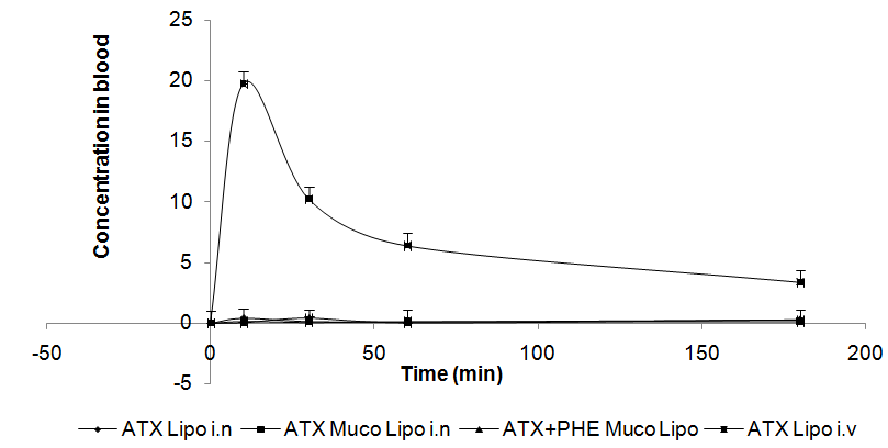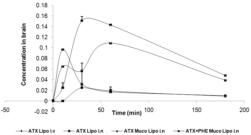 The pharmacokinetic studies revealed that the maximum concentrations (Cmax) of the drug in the brain and blood after i. n. and i. v. administration in rats were attained at different tmax values. Considering the concentration of drug achieved in the brain at a particular time interval, in the case of intranasal ATX-Lipo a lower Cmax value (0.0248) was attained at a tmax of 30 min whereas the Cmax (0.109) for intranasal ATX-Muco Lipo was achieved at tmax of 60 min.