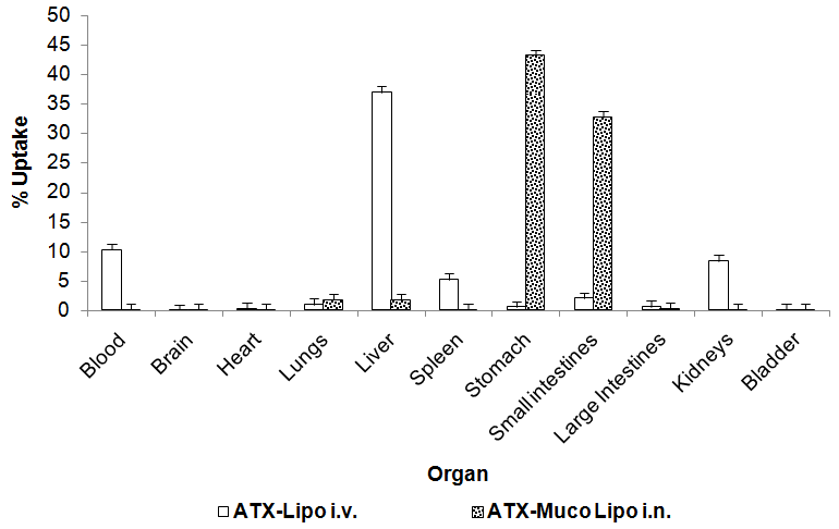 Fig. 6: Bio distribution of (A) ATX-Lipo (intravenous) and (B) ATX–Muco Lipo (intranasal) after 30 min. The values represent mean±SD of three animals, p<0.05