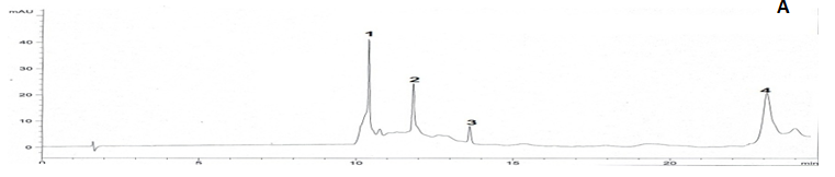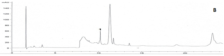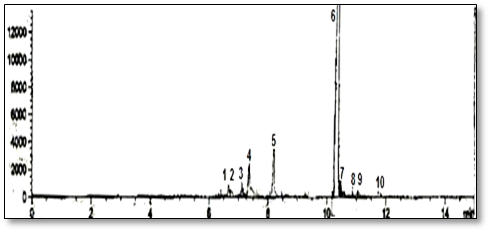 Samples were conducted on Agilent (1260 infinity) liquid chromatography controlled by the Agilent Software Solution 1.0 and with Agilent 1260 pump, degasser Agilent1260, UV detector Agilent1200. A Phenonmex C18 column (250 mm x 4.6 mm, 5 µm) was used under 40 °C, and the peaks were monitored at 220 nm. The standards and samples were eluted using a gradient mobile phase consisting of phosphate buffer (PH 3) containing 5 mM heptane sulphonic acid (A) and acetonitrile (B). The gradient conditions were: 0-5 min 100% A, 6-20 min 70% A, 21-25 min 60% A, followed by conditioning with 100% of A for 5 min. The flow was 1.5 mL/min and an injection volume of 20.0 µl. The LC/MS of the oil was carried on a Thermo Finnigan LCQ quadripole ion trap mass spectrometer (Thermo Finnigan, San Jose, CA, USA) equipped with the electro spray ionization (ESI) source. [M+H] ions were formed using ESI in positive mode. The sample dissolved in ammonium formate buffer at pH 3 was introduced to the ESI source by infusion at a flow-rate of 10 ml/min using a Harvard syringe pump drive (Harvard Apparatus, Holliston, MA, USA). A potential of 15.0 kV, a sheath gas flow rate at 30% and auxiliary gas flow-rate at 50% was employed. The heat and voltage of capillary were respectively maintained at 250 8C and 23 V. The [M+H] ion intensity was optimized by adjustment of the tube lens offset. Chromatograms are shown in (fig. 3).