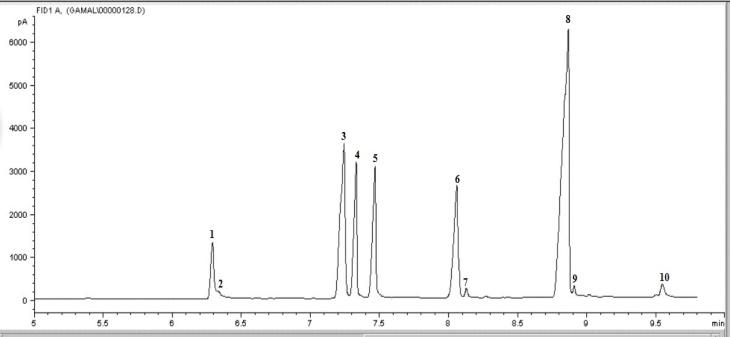 GC–MS analysis was carried out on a Gas-Chromatograph Agilent 689 gas chromatograph equipped with a mass spectrometric detector (MSD) model Agilent 5973. A fused silica capillary column (HP-5MS) 5% phenyl methyl siloxane as a nonpolar stationary phase (30 m × 0.25 mm, 0.25 µm). Temperature programming for volatile oil was from 60 °C to 180 °C at 5°C/min (5 min hold) then completed to 300 °C. Temperature programming for fatty acid methyl esters was from 120 °C to 300°C at 10°C/min (3 min hold) at 300 °C. the MSD was operated in electron impact ionization mode, scanning from m/z 50 to 550;the ion source temperature 250 °C and the quadrupole temperature 150 °C; solvent delay of 3 min was employed. The instrument was tuned using PFTBA (perfluoro-tributylamine). The components were identified by comparing their retention times and mass fragmentation patterns with those of the database libraries (Wiley [Wiley Int. USA] and NIST [Nat. Inst. St Technol., USA]). Quantitative analysis of the chemical constituents was performed by flame ionization gas chromatography (GC/FID). Under the same conditions of GC/MS analysis and percentages obtained by FID peak area normalization method. Chromatograms are shown in (fig. 1 and fig. 2).