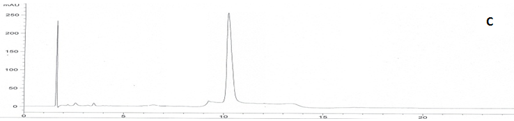 Fig. 3: HPLC chromatograms of A: garlic oil, B: formulation 2 and C: alliin (10.3 min)