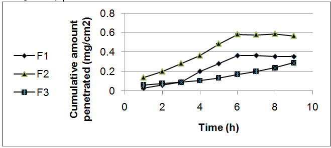 Fig. 4: Time course of the mean cumulative amount of alliin permeated through rat skin. Key: (?) formulation 1(F1), (?) formulation 2 (F2) and (*) formulation 3(F3). Each point represents mean±S. D. of 3 diffusion experiments