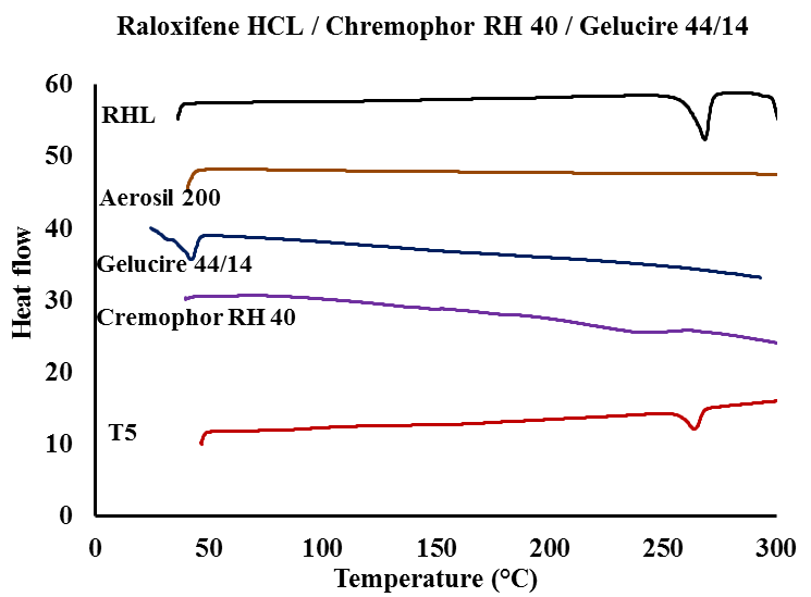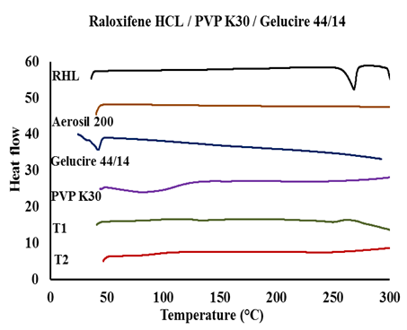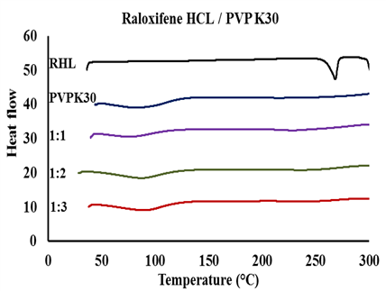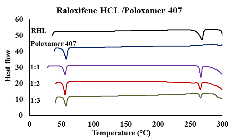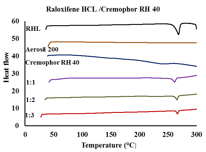 Fig. 1: Examples of the DSC traces of pure Raloxifene HCL (RHL), dispersion carriers and their binary solid dispersion systems