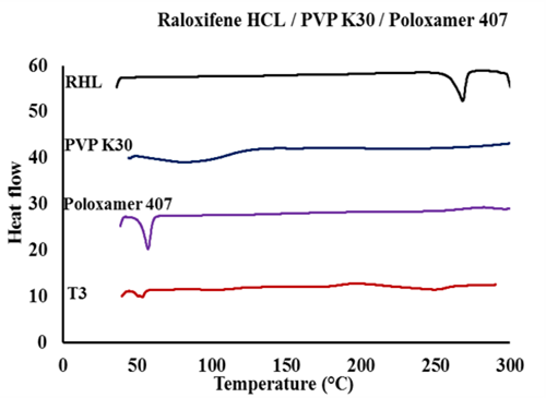 Fig. 2: Examples of the DSC traces of pure Raloxifene HCL (RHL), dispersion carriers and their ternary solid dispersion systems