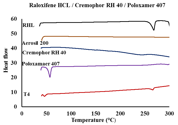 With respect to the ternary solid dispersion (T4) of RHL with poloxamer 407 and cremophor RH 40 in, the presence of aerosil 200 the DSC trace (fig. 2) showed the combined effect for the two excipients in which the Tm was marginally reduced.