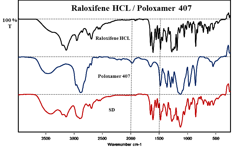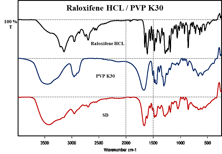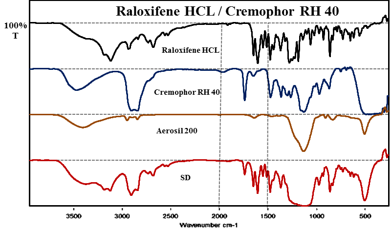 Fig. 3: FTIR spectra of Raloxifene HCL and its binary solid dispersion (SD) systems