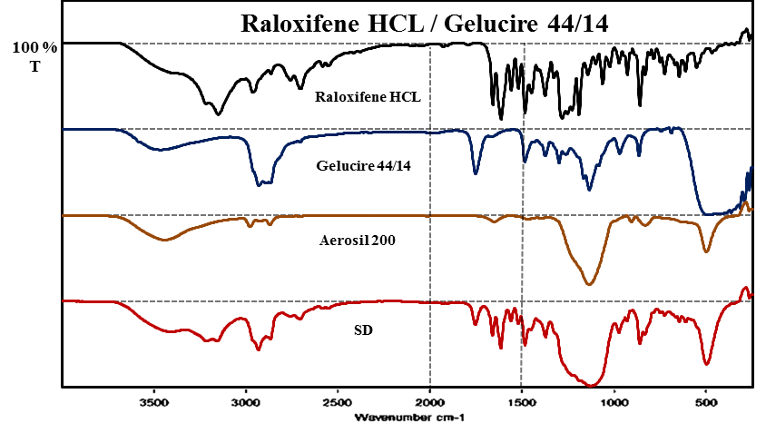 FTIR spectra of RHL, pvp k30, gelucire 44/14, cremophor RH 40, poloxamer 407 and aerosil 200, and their binary and ternary solid dispersions were recorded using a Bruker Tensor 27 FTIR spectrometer (Bruker Optics GmbH, Ettlingen, Germany) equipped with DLaTGS (DeuteratedL-alanine Triglycine Sulfate) detector. Samples were mixed with potassium bromide (spectroscopic grade) and compressed into discs using hydraulic press (cap 15T), before scanning from 4000 to 200 cm-1. Analysis of the spectra was carried out using the Bruker OPUS (OPtical User Software) Data Collection Program.