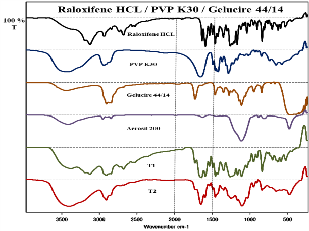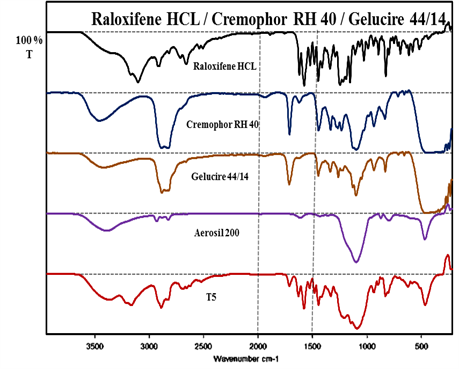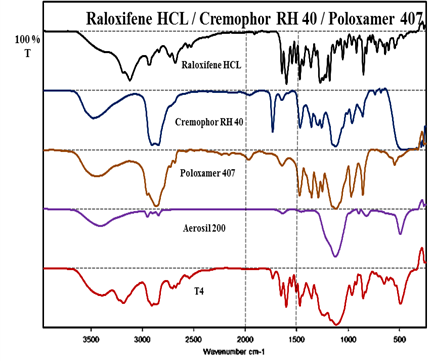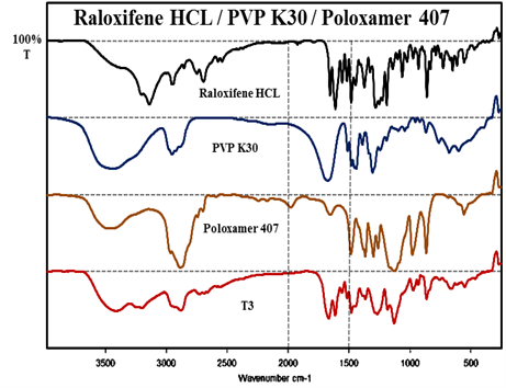Fig. 4: FTIR spectra of Raloxifene HCL and its ternary solid dispersion (SD) systems.