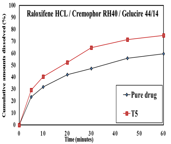 Fig. 6: The dissolution profiles of Raloxifene HCL from pure powder or from ternary solid dispersions (Error bars were omitted for clarity, formulation details are presented in table: 1).