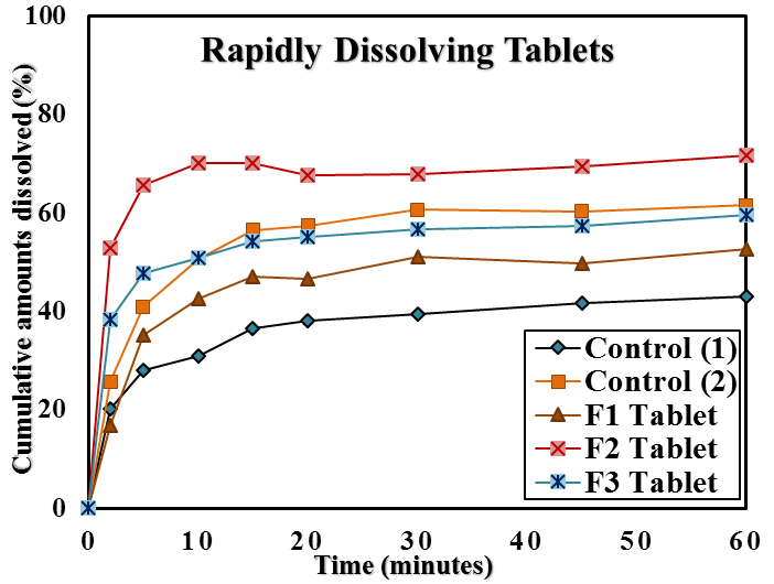 Fig. 7: Dissolution profiles of rapidly dissolving tablets. (Error bars were omitted for clarity. The details of tablet formulations are presented in table: 2)