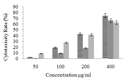 The cytotoxicity assay was determined by Cell Counting Kit 8. Approximately 1x104 cells/well of cell line were plated in 100 μl of RPMI 1640 with 2% FBS and seeded into 96 well plates. The cells were loaded with 50 μl of the extract at a concentration of 50 μg/ml, 100 μg/ml, 200 μg/ml and 400 μg/ml. The plates were then incubated in CO2 incubator at 37 °C for 48 h prior to addition of 10 μl counting reagent each well. The plate was then re-incubated at 37°C in a CO2 incubator for four hours and the absorbance of which was read using microplate reader at 450 nm. This assay was carried out in triplicate.