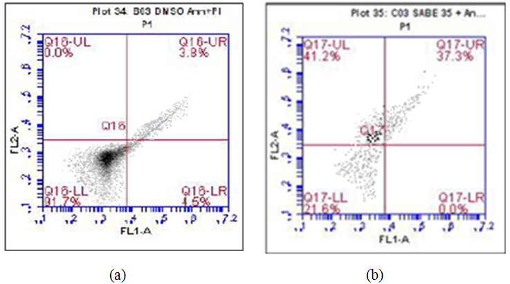 The apoptosis effect of the extracts on MOLT4 showed several results, as reported in table 2 and one of flow cytometry outputs in Fig.2. The viability of cells treated with SAB extracts decreased and their apoptosis activity appeared as late-phase apoptosis. SAB E 35 was capable of decreasing viable cells the most, i.e. remained only 22.70 % and 37.07% cells on late apoptosis phase. However, dead cells cannot be detected whether they death or not by apoptosis effect or any other mechanisms. The number of cells treated for this analysis has dramatically decreased, compared with the control cells. This was expected because cells were dead early while being treated and wasted away during assay process.