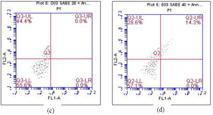 Fig. 2: Flow cytometry outputs of apoptosis effect on MOLT4. LL quadrant: viable cells; LR quadrant: early apoptosis; UR quadrant: late apoptosis; UL quadrant: dead cells. (a) control cells; (b) cells treated with SAB E 35; (c) cells treated with SAB E 38; (d) cells treated with SAB E 40