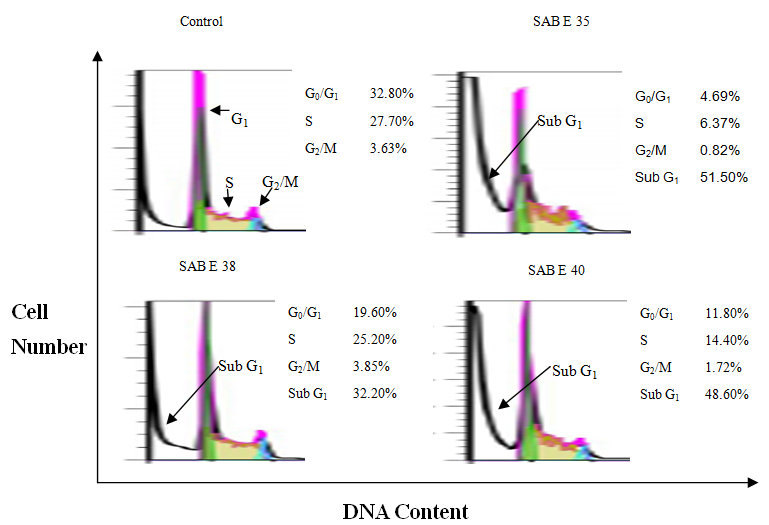 Cells treated with SAB E 35 sample at IC50 concentration contained different DNA compared with the control ones. A significant decrease was seen in the number of treated cells in S phase, G0/G1 and G2/M fraction, in addition to the accumulation of cell populations in sub-G1 fraction (fig. 3). The most dramatic change of DNA content occurred in cells incubated in SAB E 35. The G0/G1 phase, S phase and G2/M phase of cells treated with SAB E 35 decreased into 4.69%, 6.37% and 0.82%, respectively, while for the control cells were 32.80%, 27.7% and 3.630%, respectively. However, sub-G1 fraction increased from 2.45% to 51.50%.