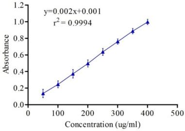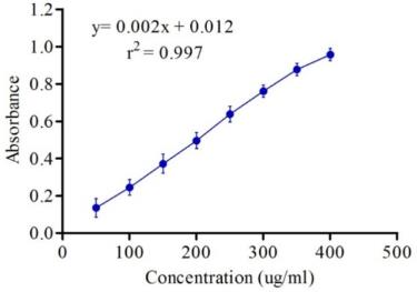 The linearity of analytical procedure was determinedusing standard concentration of NFH ranging from 50-400 µg/ml in phosphate buffer, pH 7.4. Standard solutions of NFH were prepared in triplicate and subjected to determination of absorbance at 266 nm. A standard curve was prepared by plotting actual concentration (μg/ml) vs. absorbance and correlation coefficient was calculated. The correlation coefficient was used for evaluation of linearity of analytical procedure [14, 17].