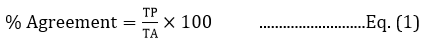 Where, TP is tested result in the presence of excipients (poly-methacrylate nanospheres), and TA is tested results in the absence of excipients. % RSD was calculated for % agreements which should be less than 2% for validating the specificity of the analytical method.