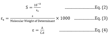 Where, εs is the specific absorptivity and its value (in ml/g/cm) corresponds to the determinant in a cuvette with an optical length of 1 cm, ε is molar absorptivity, C is the molar concentration of the determinant, and d is path length (1 cm) [15, 17, 18].