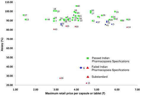 Fig. 2: Maximum retail price versus assay plot showing generic amoxicillin products (N=46) quality
