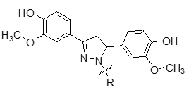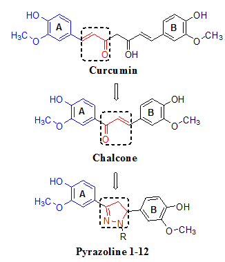 The novel pyrazoline derivatives (1-12) have been designed by utilizing the structural features in Curcumin. We design chalcone that resembles aryl-α,β-unsaturated carbonyl portion of Curcumin but by reversing the position of the double bond and the carbonyl group, then chalcone was cyclized to provide a series of novel pyrazoline derivatives (1-12) table 1, fig. 1.