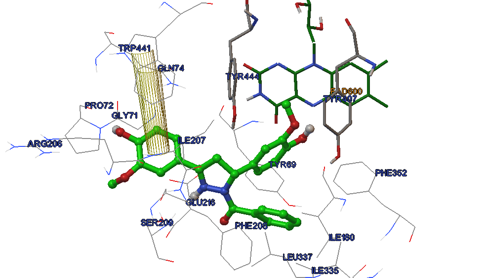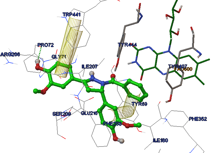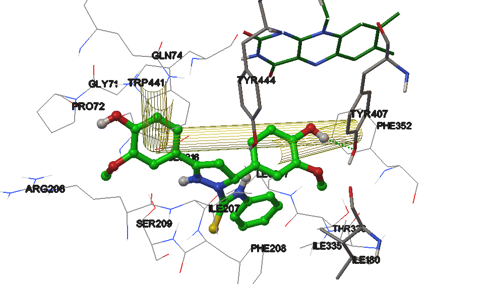 R-isomer Phenyl ring (Ring A) at 3rd position of pyrazoline occupy pocket 3, and establishes π-π interaction with Trp441and Phe352. Phenyl ring (Ring B) at the 5th position of pyrazoline towards pocket 1 and establishes π-π interaction with Phe352, moreover ring B-hydroxy oxygen forms a hydrogen bond with the oxygen of Tyr407. The substitution at 1N position of pyrazoline orient towards pocket 2 fig. 4.