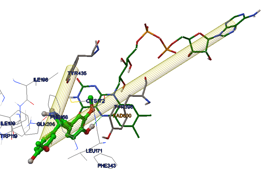 R-isomer Phenyl ring (Ring B) at the 5rd position of pyrazoline orient towards the aromatic cage, the hydroxy group of ring B established H-bonding interaction with 5N of FAD, this interaction is mainly stabilized by the strongπ-π interaction between Bring of the compound 1and the FAD. Phenyl ring (Ring A) at the 3th position of pyrazoline keeps in the hydrophobic pocket and anchoring from their face of FAD with a distance of 3.564 Å, moreover establishes π-π interaction with Tyr435 fig. 5.