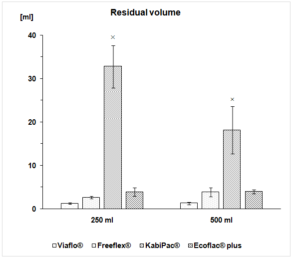 Fig. 1: Final residual volumes after gravity drainage under closed-vent conditions for different container types, volumes, and brands. KabiPac® significantly differs from the other 250 ml as well as 500 ml containers tested. Data are expressed as means±SD, n = 10.× p<0.001 KabiPac® 250/500 vs. Viaflo® 250/500, Freeflex® 250/500 and Ecoflac® Plus 250/500