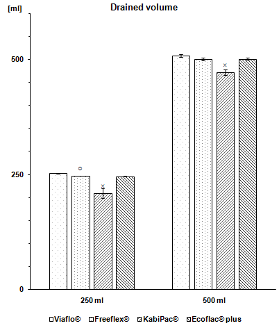 Fig. 2: The mean drained volume after gravity drainage under closed-vent conditions for different container types, sizes, and brands. In the group with the declared volume of 250 ml, only Viaflo® reached the declared drained volume and significantly differed from Freeflex® and KabiPac®. In the group of 500 ml containers, only KabiPac® did not reach the declared volume and significantly differed from the other containers tested. Data are expressed as means±SD, n = 10. ? p<0.05 Viaflo® 250 vs. Freeflex® 250; × p<0.001 Viaflo® 250 vs. KabiPac® 250 × p<0.001 KabiPac® 500 vs. Viaflo® 500, Freeflex® 500 and Ecoflac® Plus 500