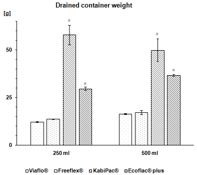 Fig.3: Comparison of the mean final weight of empty containers after gravity drainage. Viaflo® showed the significantly lowest final weight compared with Ecoflac® Plus and KabiPac® for containers with the declared volume of 250 ml as well as 500 ml (× p<0.001). Data are expressed as means±SD, n = 10. × p<0.001 Viaflo® 250/500 vs. KabiPac® 250/500, and Viaflo® 250/500 vs. Ecoflac® Plus 250/500, Freeflex® 250/500 vs. KabiPac® 250/500 and Freeflex® 250/500 vs. Ecoflac® Plus 250/500