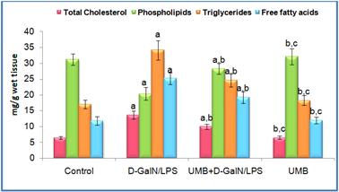 Methods: Male wistar rats were challenged with a single intraperitoneal injection of D-GalN/LPS, and the protective nature of UMB was examined with reference to Total Cholesterol, Phospholipids, Triglycerides, free fatty acids(plasma, liver, and kidney), lipid metabolizing enzymes and lipoprotein fraction.