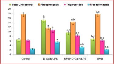 Results: Anomalies in lipid status, lipid metabolizing enzymes and lipoprotein fractions induced by D-GalN/LPS was restored to near normal levels upon pretreatment with UMB which was further confirmed by Transmission electron microscopic observations.