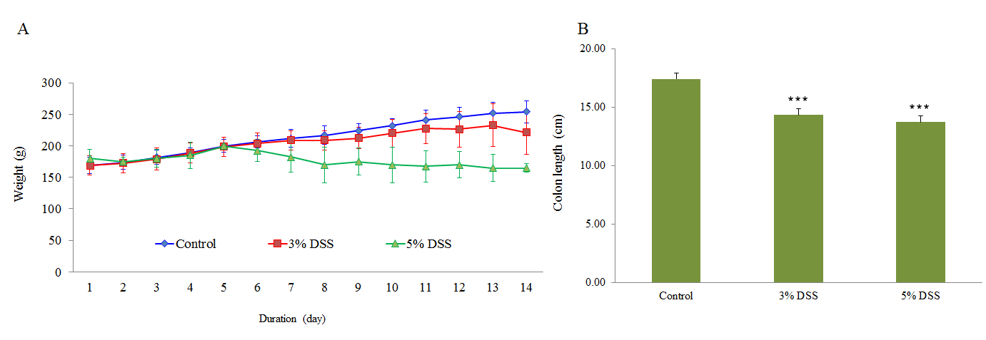 As detailed, rats were fed with different concentration (3, 5%) of DSS for seven days, followed by animals were maintained for another seven days with regular diet. During the experimental period (14 d), the weight of the animals was recorded and found that DSS exposure gradually reduces the weight gaining in a concentration-dependent manner.