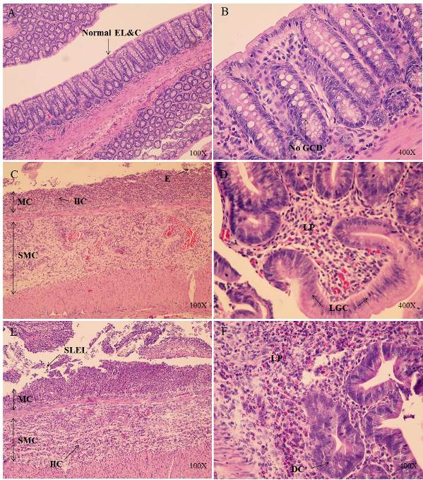 Fig.2: Histological profile of a distal region of the DSS-treated and control rats observed with the aid of Hematoxylin and Eosin stain. EL: epithelial lining, C: crypts, GCD: globlet cell depletion, LP: lamina propria, IIC: infiltration of inflammatory cells E: erosion, MC: mucosa, SMC: submucosa, LGC: loss of globlet cells, SLEL: severe loss of epithelial lining, DC: dysplastic crypt