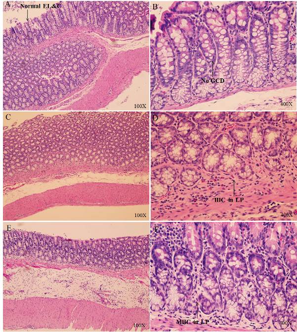 Fig.3: Histological profile of proximal region of the DSS-treated and control rats observed with the aid of Hematoxylin and Eosin stain. EL: epithelial lining, C: crypts, GCD: globlet cell depletion, LP: lamina propria, IIIC: increase infiltration of inflammatory cells, MIIC: mild infiltration of inflammatory cells