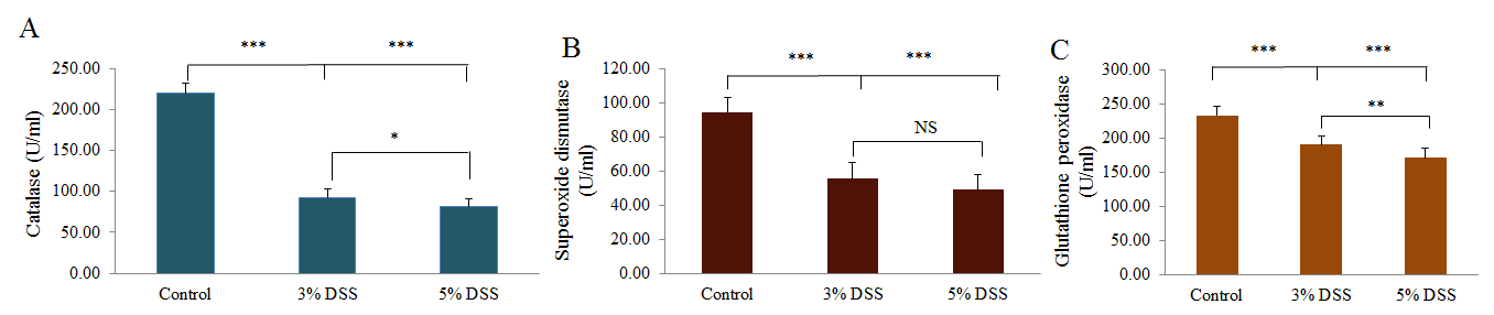 The reduction in the level of SOD and CAT has been reported in plasma samples of DSS-treated rats [25]. The current study also suggested that DSS affect the antioxidant system of host thereby it facilitates the diseased condition.