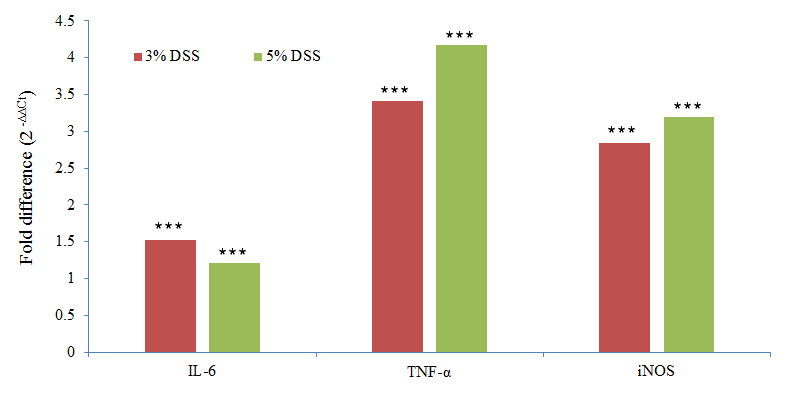 Fig.6: The expression pattern of selected inflammatory genes. The values were expressed as fold changes in DSS-treated group, and the values are normalized with control group and internal control gene (β-actin) (*** p<0.001)