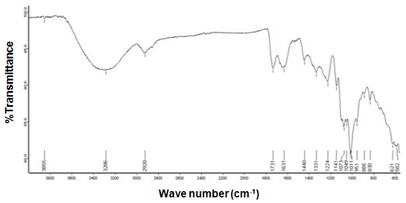 The FT-IR spectrum is used to determine the major functional groups present in the structure. The recorded FT-IR spectrum of CLM is presented in fig. 2 which shows a characteristic spectrum for polysaccharides. The peak present at 3266 cm-1 (OH stretching) is attributed to hydroxyl groups, while the peaks at 1731 cm-1, at 1631 cm-1 and at 1440 cm-1 (C=O stretching) are may be due to carboxyl groups [35]. Specifically the peaks at 1331 cm-1, 1224 cm-1, 1141 cm-1 (C-O-C),1073 cm-1 (C-H aromatic) and at 1011 cm-1 (C-O) indicate the presence of uronic acid and O-acetyl groups; and peaks at 951 cm-1(O-H), at 920 cm-1 (OH) and at 830 cm-1(C-H bending aromatic ring) are taken as evidence for β-and α-linkages in the molecule respectively[36].