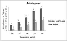 Fig.1: Reducing the power of total crude alkaloid extract of Glycosmis pentaphylla leaves. Each value is expressed as mean±standard error done in triplicates. Data were analysed by ANOVA SPSS version 12.0 for windows followed by DMRT for comparison (p<0.05). Mean values followed by different superscript in a column are significantly different