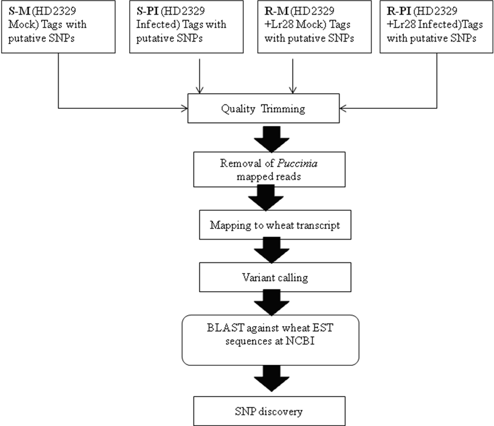 Using SOLiD sequencing, we generated four high-quality libraries of SOLiD-SAGE reads namely, S-M, S-PI, R-M and R-PI. In total, 1, 65, 767, 777 reads with an average length of 34.85 bases were generated (table 2). After trimming low-quality reads, poly A/T tails, adaptor sequences, about 38, 180, 500 reads with an average length of 28.9 were retained (table 2). The library S-PI and R-PI contain Puccinia reads so, it was necessary to remove these reads. The Puccinia reads were removed by mapping it to the reference available at The Broad Institute. The libraries of S-PI and R-PI, as expected, mapped more i.e. 20.9% and 19.4% to Puccinia specific reads (table 3). After removing Puccinia specific reads about 30,894,161 reads were retained for subsequent analysis and SNP discovery.