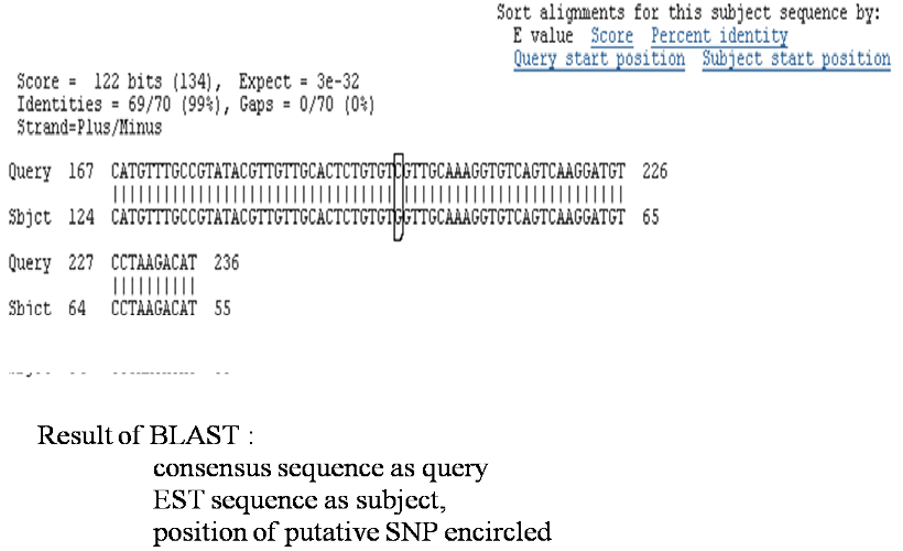 To reduce the rates for misidentification of SNPs or removal of uninformative SNPs, post-processing of the predicted SNP data was done. BLAST was performed considering the consensus sequence which comprises of predicted SNPs as a query against NCBI wheat EST database. The best hit which do not contain any gaps or Ns and has mismatch only at the position of predicted SNPs was selected for further processing (fig. 1).
