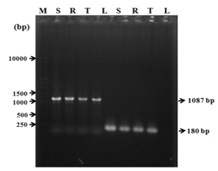 Fig.1: PCR amplification of 16S rRNA gene from rhizosphere and plant tissues of C. asiatica, the first steps (left:~1087bp) andsecond steps (right:~180bp),(M): marker 1 Kb; (S): rhizosphere; (R): roots; (T): stolons; (L): leaves