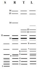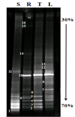 Fig.2: A): DGGE band profile of the PCR products of 16S rRNAgene from rhizosphere and plant tissues of C. asiatica, B): Illustration of DGGE bands using 1D Phoretix software showing 1-16 excised bands, C): Re-amplification DGGE bands, (S): rhizosphere; (R): roots; (T): stolons; (L): leaves