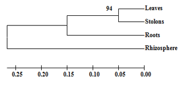 There were 16 bands in the leaves, 14 bands in stolons, 12 bands in the roots, and 10 bands in the rhizosphere (fig 2B). This data was also supported by an index value of alpha diversity (Shannon-Wiener/He) (table 2).