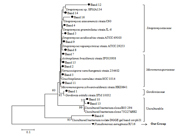 Sixteen bands were excised from the polyacrylamide gels, reamplified, and sequenced. BLAST. N analyses revealed that 16 bands (83%-100% of maximum identity) were closely related to 3 families of actinobacteria. A total of 7 bands were related to Streptomycetaceae, 5 bands related to Micromonosporaceae, and 1 band related to Gordoniaceae. Meanwhile, three other bands, namely bands 6, 10, and 13 still belonged to unculturable species. There were 6 genera under those families, consist of Streptomyces, Micromonospora, Verrucosispora, Actinoplanes, Couchioplanes, and Gordonia. The study found that Streptomyces species was dominant in all samples. The BLAST. N analysis also showed that bands 6, 12, 13, and 16 have similar identity lower than 97% of the total sequence ~180 bp, this may indicate a novel species. Details of the sequence identities and their similarity percentages were given in table 4. Phylogenetic analysis showed that the whole sequence of the bands has a good consistency with their affiliation and separated from their out-group Pseudomonas aeruginosa RJ 16 (Gram-negative bacteria) (fig 4).