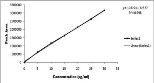 10 mg of Ramipril was weighed accurately and transferred to 10 ml volumetric flask and then volume was adjusted to the mark with the mobile phase, to give a stock solution of 1000 µg/ml. From stock solution of Ramipril 1 ml was taken and diluted up to 10 ml with the mobile phase, to give a stock solution 100 µg/ml. From this solution 0.5, 1.0, 1.5, 2.0, 2.5, 3.0 ml solution was transferred to 10 ml volumetric flask and make up the volume up to 10 ml with mobile phase gives standard drug solution concentration ranges of 5, 10, 15, 20, 25, 30 µg/ml. Each of the standard drug solution was injected 3 times and the mean peak area of drug was calculated and plotted against the concentration of the drug. The regression equation was found out by using this curve. Mean AUC recorded for all the concentration range and typical calibration curve was shown in fig. 2.