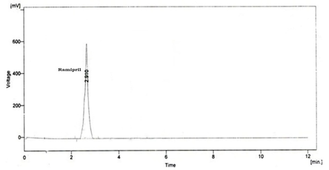 The HPLC procedure was optimized with a view to develop accurate and stable assay method. The drugs Ramipril was run in mobile phase composition with different ODS C18 columns (Kromacil; 250 mm ×4.60 mm). The flow rate was maintained at 1 ml/min with temperature at 44ºC; detection at 210 nm gave sharp and symmetrical peak with retention time 2.910 min of Ramipril. The typical chromatogram of the Ramipril was shown in fig. 3.