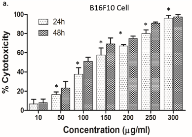 To determine the cell viability by PE extract, we performed an MTT assay. As the concentration of the drug increases the number of dead cell increases. PE extract treatment of B16F-10 cells significantly decreased the viability in a dose and time-dependent manner (Fig.2). The IC50 values for the B16F-10 melanoma cell was 145.98±7.49 µg/ml and 121.60±6.20 µg/ml for 24h and 48h respectively. Doxorubicin was used as a positive control, and IC50 values were found to be 7.91±0.98 and 6.18±0.62 µg/ml for 24h and 48h respectively.