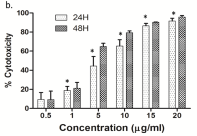 This assay was performed according to a slight modification of the procedure reported by Mosmann [12]. All cells were grown as a monolayer in 96 well plate seeded at a density of 5,000 cells/well/200 µl of complete medium. The cells were grown for 24 h before drug treatment. The different concentration of the extract was treated for another 24 and 48 h after that cytotoxicity were determined by MTT assay. 20 µl of MTT (5 mg/ml) were added to each well and kept in the dark for another 4 h at 37 °C. The formazan crystal formed was dissolved in 100 µl of DMSO and reading was taken at 570 nm in Elisa plate reader (Molecular Devices Inc., Sunnyvale, CA, USA). Doxorubicin was used as a positive control.
