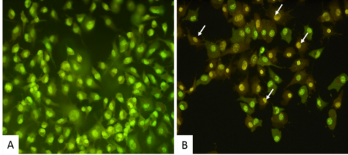 Fig. 3: Apoptosis of B16F-10 cells stained with AO/EB and viewed under a fluorescence microscope (magnification 200x). White arrow indicates cell undergoing morphological changes and apoptosis. A. Control, B. PE extracts treated (145 µg/ml) for 24h