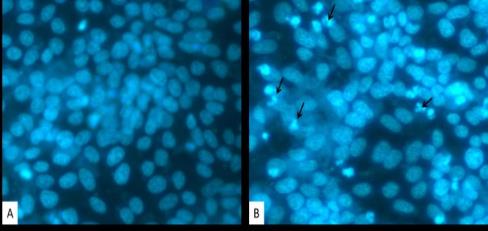 Fig. 4: Apoptosis in B16F-10 cells following 24h of PE extract exposure stained with nuclear dye DAPI. Arrows indicate the cell undergoing apoptosis and nuclear fragmentation. A. Control, B. 145 µg/ml of PE extract treated