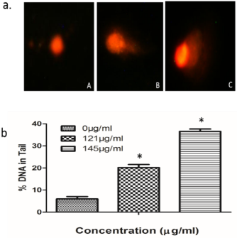 Fig. 5: DNA damage in PE extract-treated for 24h in B16F10 melanoma cancer cell as revealed in the comet assay. a. A. Control (DNA damage 5.96±1.07), B. 121 µg/ml (DNA damage 20.17±1.41) and C. 145 µg/ml (DNA damage 36.62±1.02). b.*P<0.05 from untreated cells